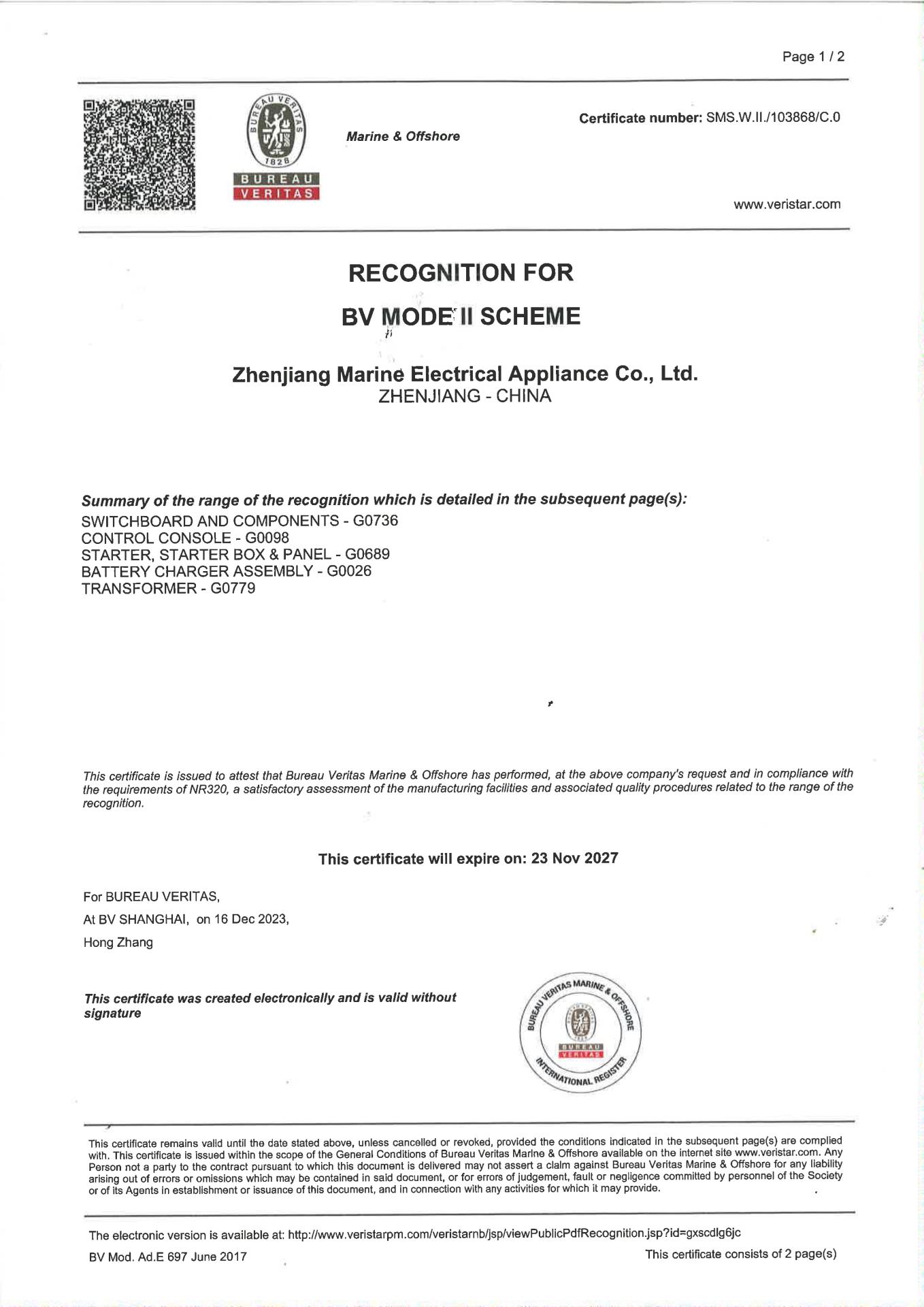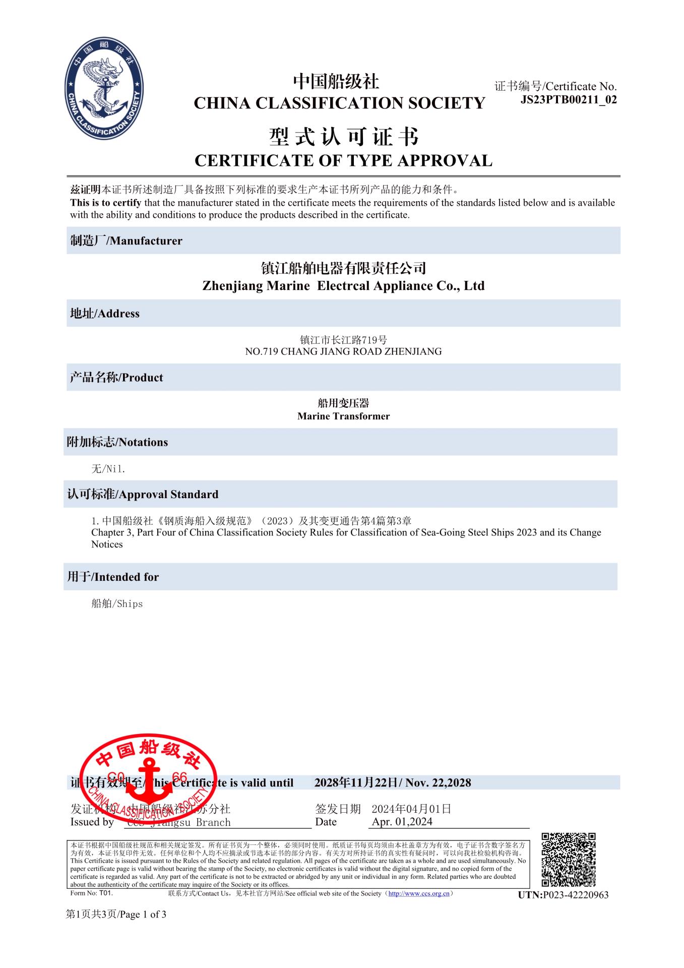 船用变压器型式认可证书