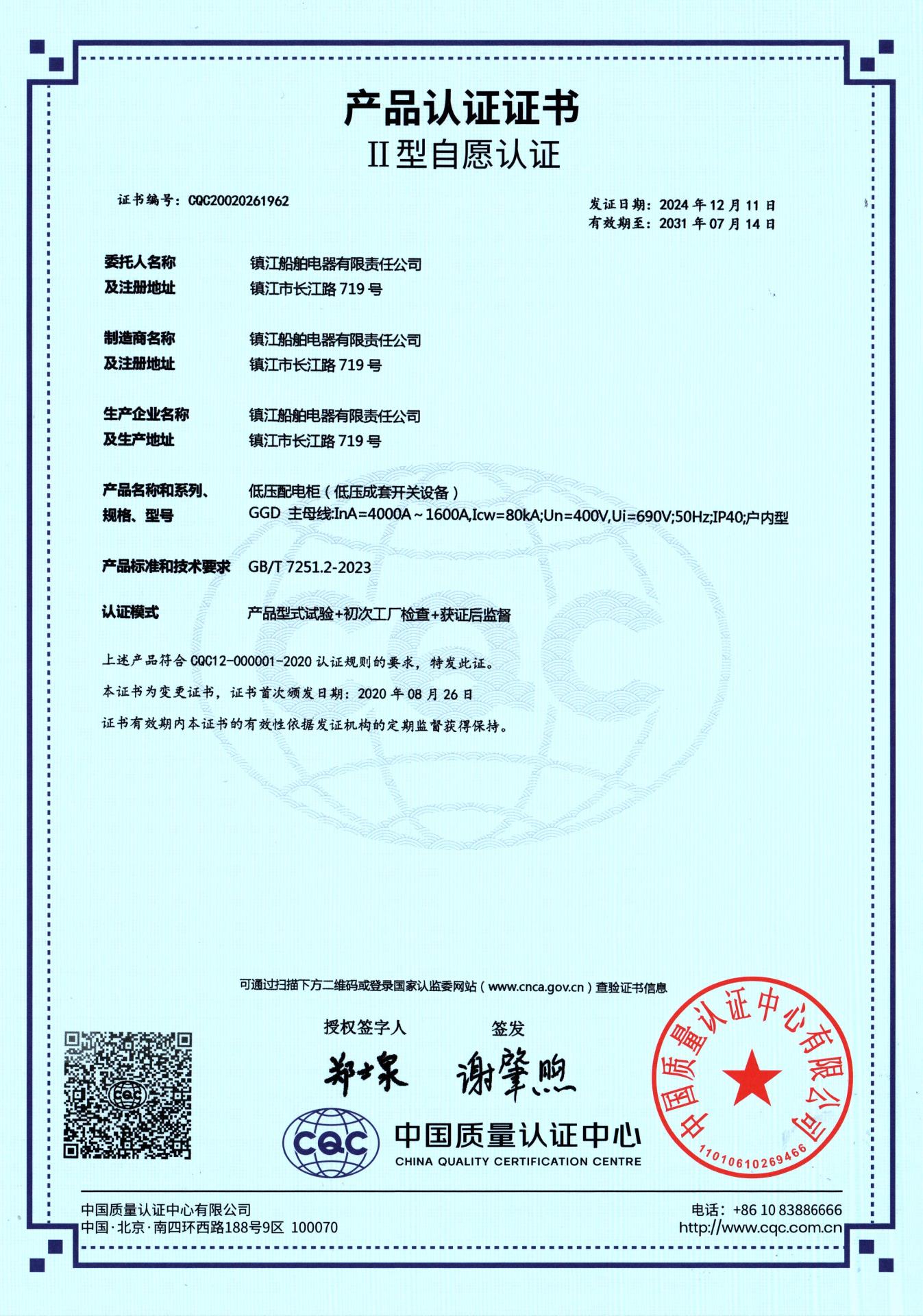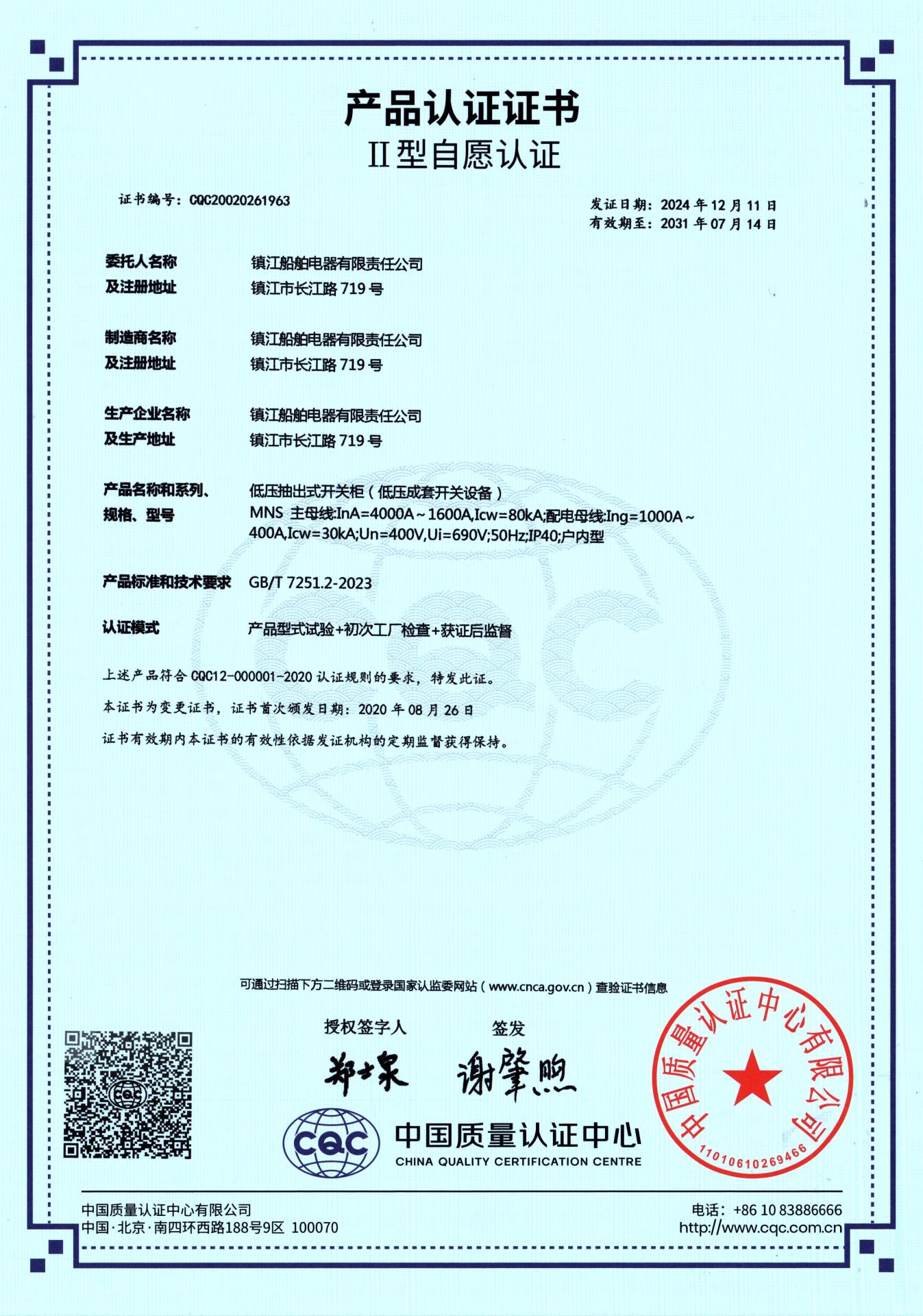 CQC产品认证-Ⅱ型(低压配电柜)